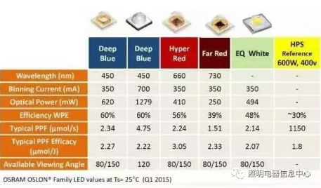 據了解,過去幾年來,歐司朗光電半導體為植物照明產品組合增添了新封裝,并將效率提升高達20%。主要是增加了一款120° Oslon產品,使得450nm(深藍光)、660nm(超紅光)和730nm(遠紅光)版本除了80° 和150° 外又多了一個選擇。這一方案組合構成針對各種植物定制不同照明方案的基礎,可根據各種植物的具體需求調整光線。